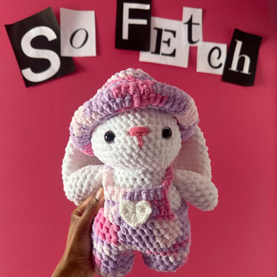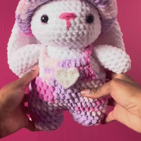 Cutest Bunny you’ve ever seen ! This crochet Bunny is handcrafted to be squished and cuddled ! Made soft, not firm, for extra comfort. Fashion with a bucket hat and cutesy overalls that are 100% removable. A perfect gift for plushie lovers or a cozy addition to your collection !!